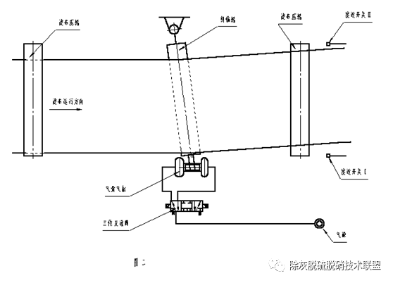(3)如圖示:當(dāng)濾布向接近開關(guān)Ⅱ方向跑偏時,濾布觸動撥桿使感應(yīng)板接近開關(guān)Ⅱ,當(dāng)達到感應(yīng)距離時,接近開關(guān)Ⅱ輸出信號,使二位五通閥Ⅱ通電換向,二位五通閥ⅡB輸出壓縮空氣,A排空;氣缸Ⅱ活塞桿伸出;此時糾偏輥如圖示偏轉(zhuǎn)一定角度,在圖示糾偏輥作用下,濾布的跑偏迅速糾正,向接近開關(guān)Ⅰ方向移動;當(dāng)?shù)竭_中間位置時,接近開關(guān)Ⅱ感應(yīng)信號消失,氣缸Ⅱ又重新回到圖一狀態(tài)。
