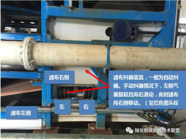 它由糾偏輥、糾偏氣囊、二位五通電控滑閥和感應(yīng)開關(guān)等組成。它的作用就是糾正濾布跑偏,其原理是通過改變糾偏輥的角度來達到糾正濾布跑偏的。